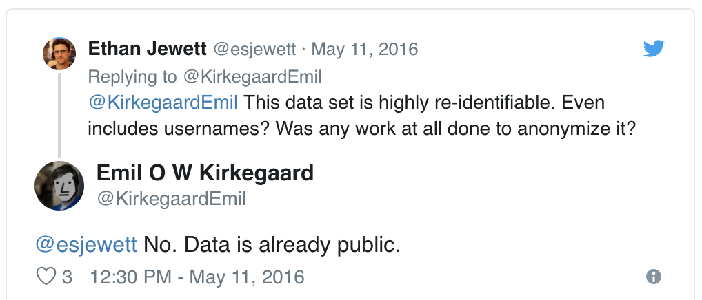 Some may object to the ethics of gathering and releasing this data. However, all the data found in the dataset are or were already publicly available, so releasing this dataset merely presents it in a more useful form.